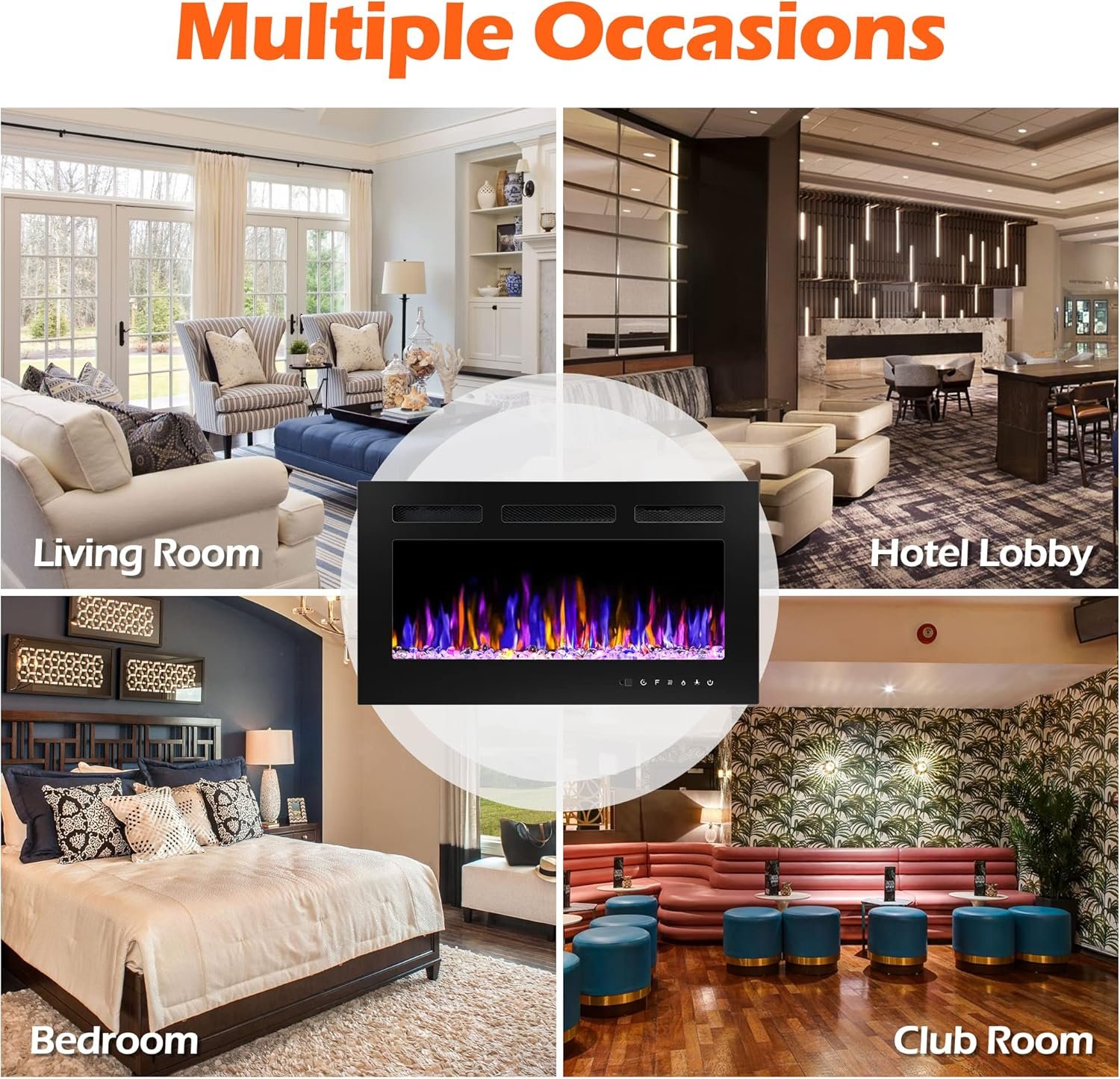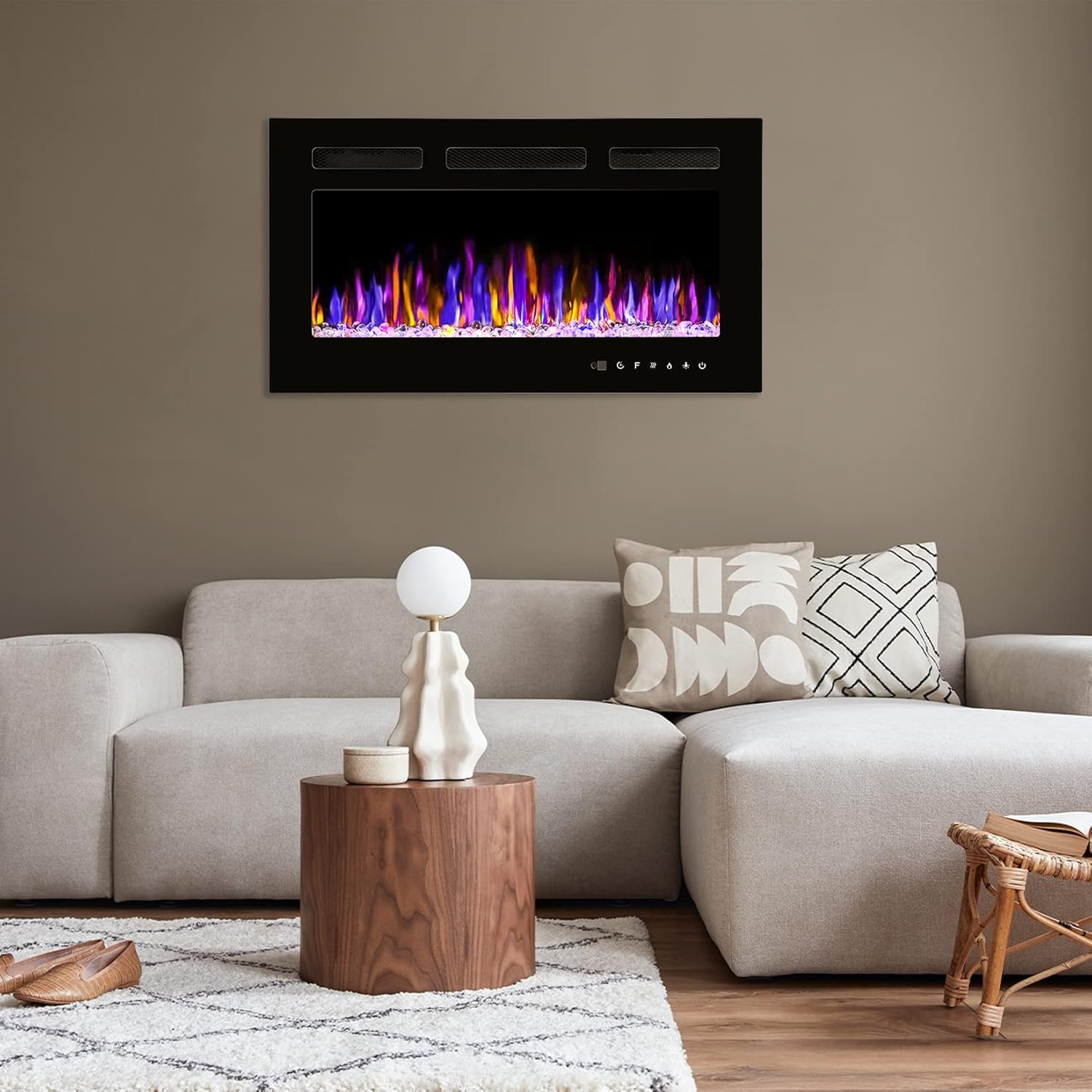 The BETELNUT 30″ Electric Fireplace offers a sleek, ultra-thin design suitable for wall-mounted or recessed installation. With 12 flame color options and 5 brightness levels, it creates a customizable ambiance. The 750/1500W heater efficiently warms spaces up to 400 sq. ft., while the remote control and touch screen provide convenient operation. Enhance your home’s atmosphere with this modern, energy-efficient fireplace.