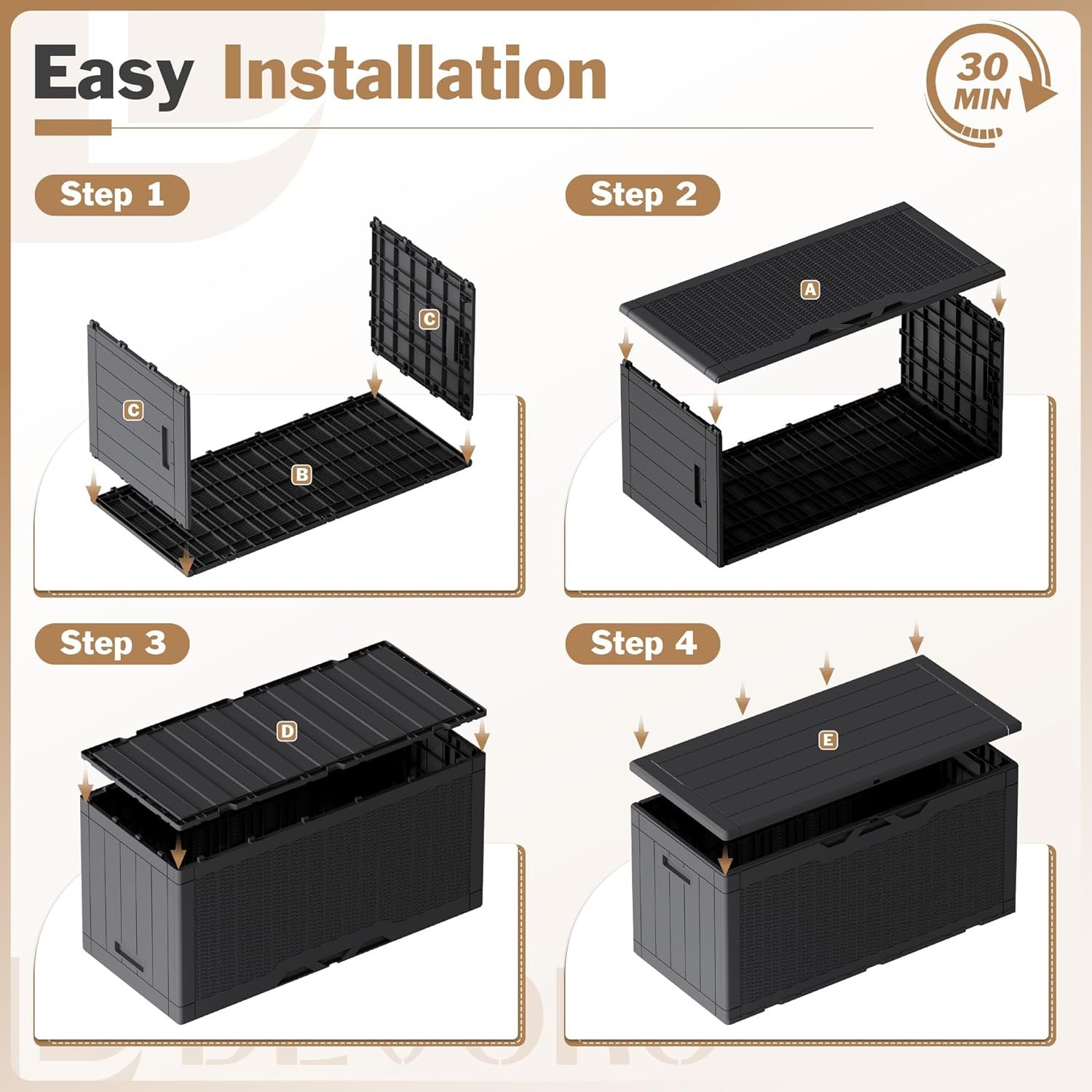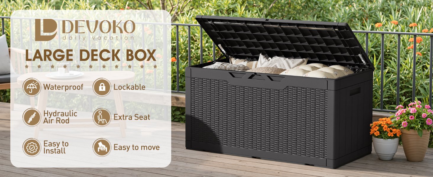 The Devoko 100-Gallon Waterproof Lockable Resin Deck Box offers durable, weather-resistant storage for any outdoor space. Crafted from premium resin with a stylish rattan texture, it protects your items from rain, dust, and UV rays. The lockable lid and gas-lift hinges ensure easy, secure access, while the large 100-gallon capacity provides ample room for cushions, garden tools, and pool supplies. Keep your patio neat and organized with this versatile outdoor storage solution.