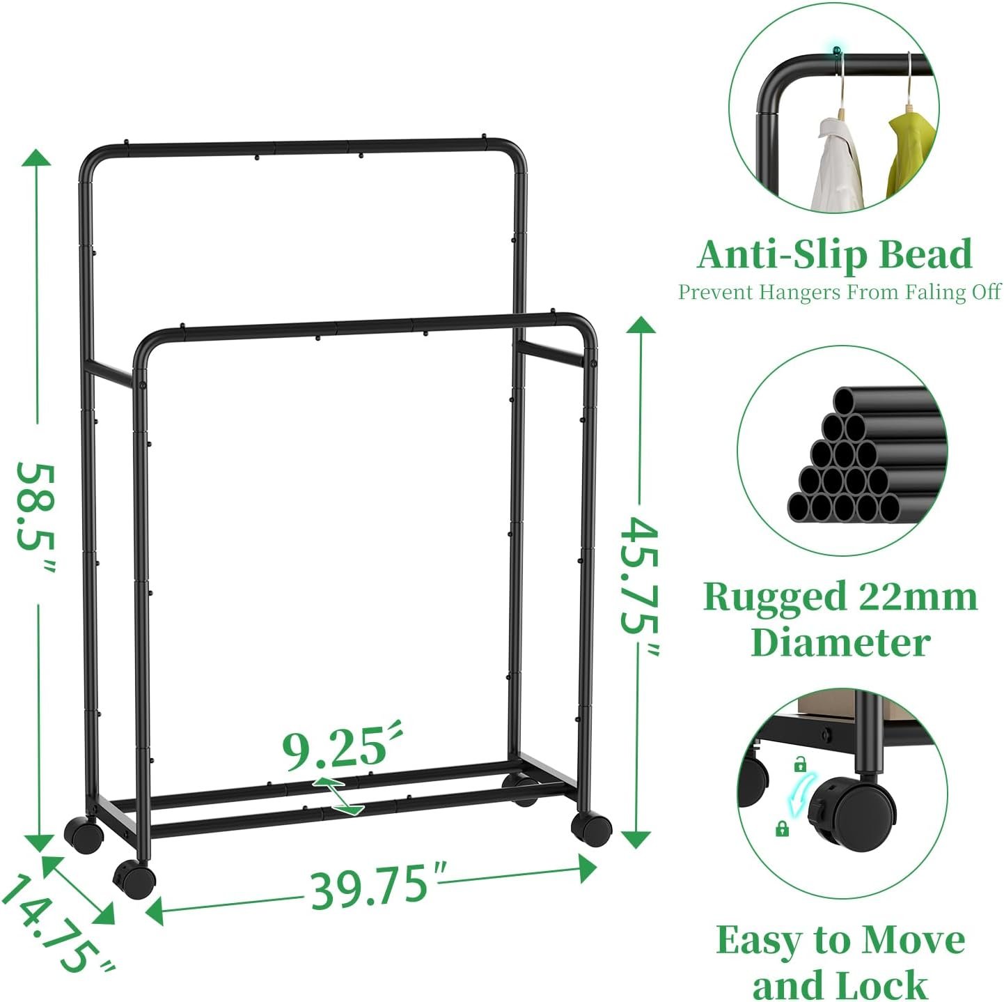 Enhance your storage solutions with the Simple Trending Standard Clothing Garment Rack. Crafted from durable metal with a powder-coated finish, this rack offers a sturdy structure that resists rust and corrosion. Its extendable top rod, ranging from 30.5″ to 47.5″, provides ample hanging space for various garments. Equipped with heavy-duty 360° wheels, it ensures easy mobility, allowing you to reposition the rack effortlessly. The integrated bottom shelf offers additional storage for shoes, boxes, or accessories, maximizing your space efficiently. Ideal for laundry rooms, bedrooms, or retail displays, this garment rack combines functionality with sleek design. Assembly is straightforward, and the rack’s compact dimensions make it suitable for various spaces.