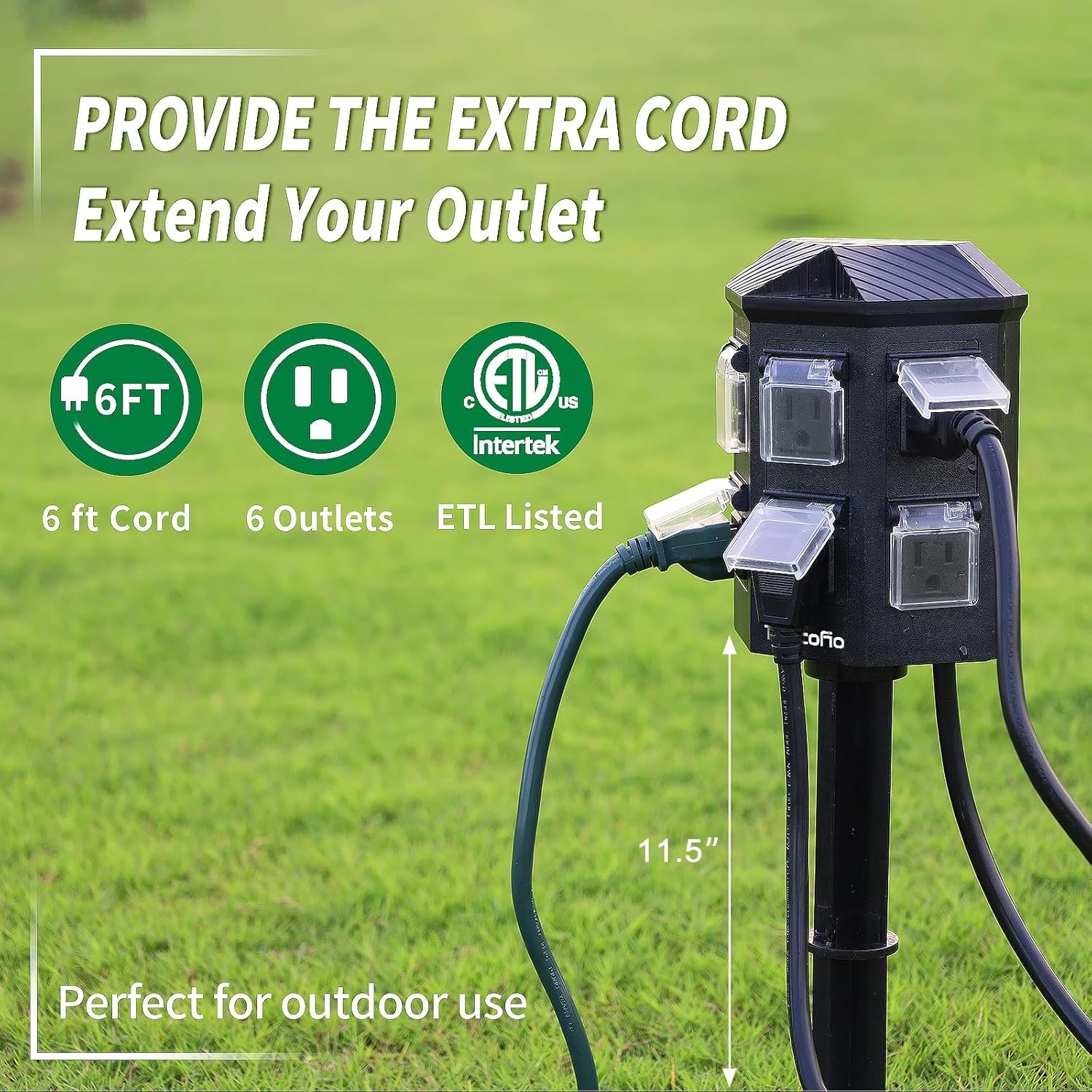 The TiFFCOFiO Outdoor Power Stake Timer is a versatile, weatherproof control hub ideal for holiday lights, garden décor, and outdoor lighting. With a 100-ft remote, a photocell dusk-to-dawn sensor, and multiple countdown timer modes, it delivers automation and convenience. Six grounded outlets with waterproof covers offer reliable, safe control over your displays. Elevate your outdoor lighting—check it out today.