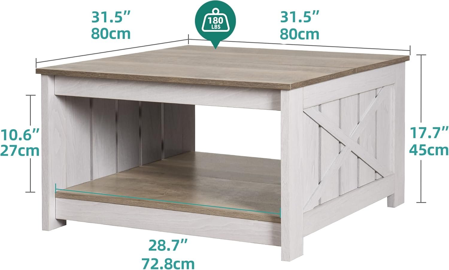 Blending rustic charm with practical utility, the YITAHOME Farmhouse Storage Coffee Table (Grey Wash) offers stylish elegance and organizational versatility. With a 31.5″ × 31.5″ footprint and 17.7″ height, this square table features a two-tier open and half-open design to neatly display décor or stow essentials. Its scratch-resistant, waterproof top ensures long-lasting beauty, while the sturdy X-frame structure supports up to 180 lbs. Perfect for living rooms, offices, or lounges, this table elevates your space with both form and function. Discover how it fits your room—check it out today.